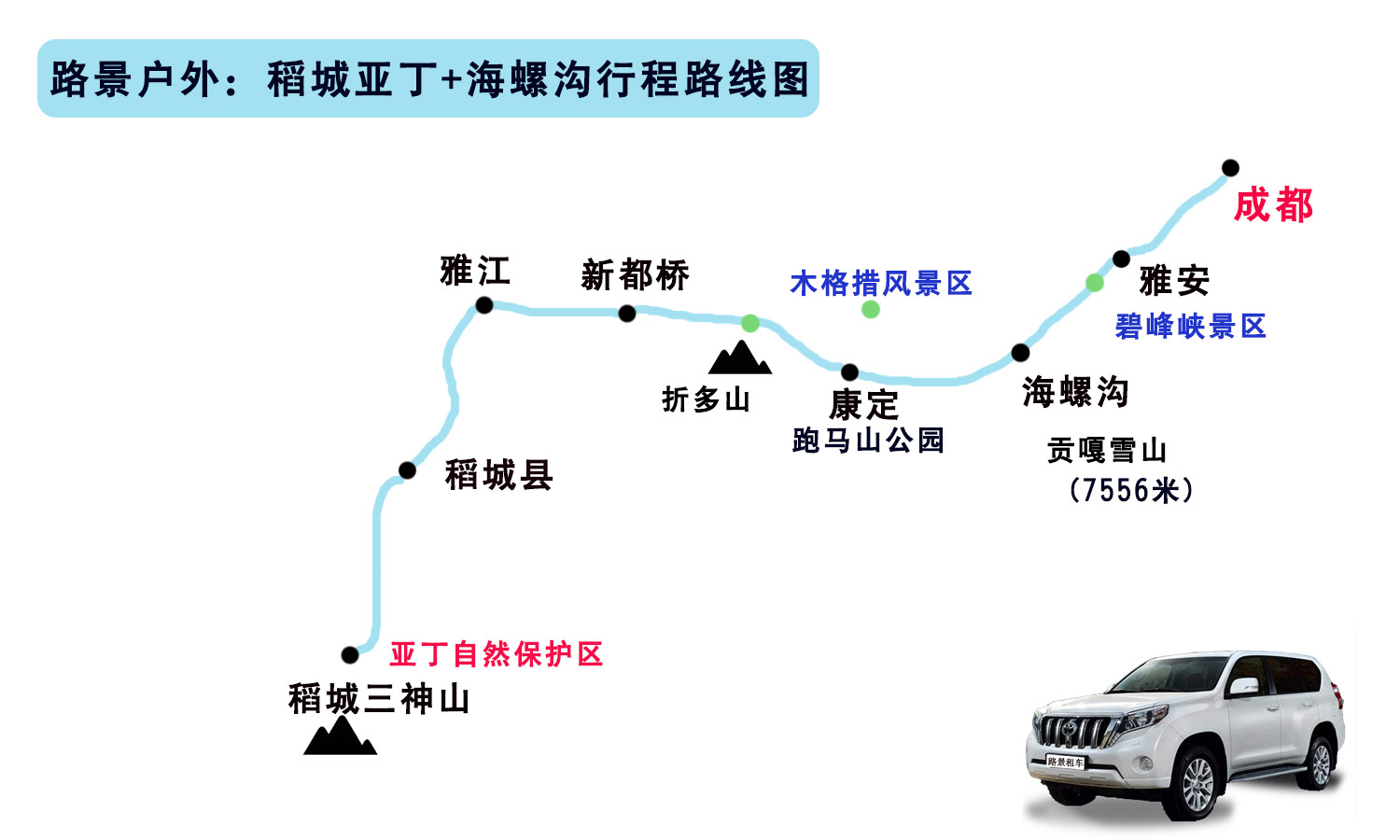 從成都租車自駕走稻城亞丁我們一般都推薦越野車型,一般越野車有三菱獵豹,三菱帕杰羅V73,三菱勁暢,豐田普拉多2.7,豐田普拉多4.0,豐田漢蘭達(dá),豐田陸地巡洋艦,豐田陸巡100型,途觀,牧馬人等越野車!