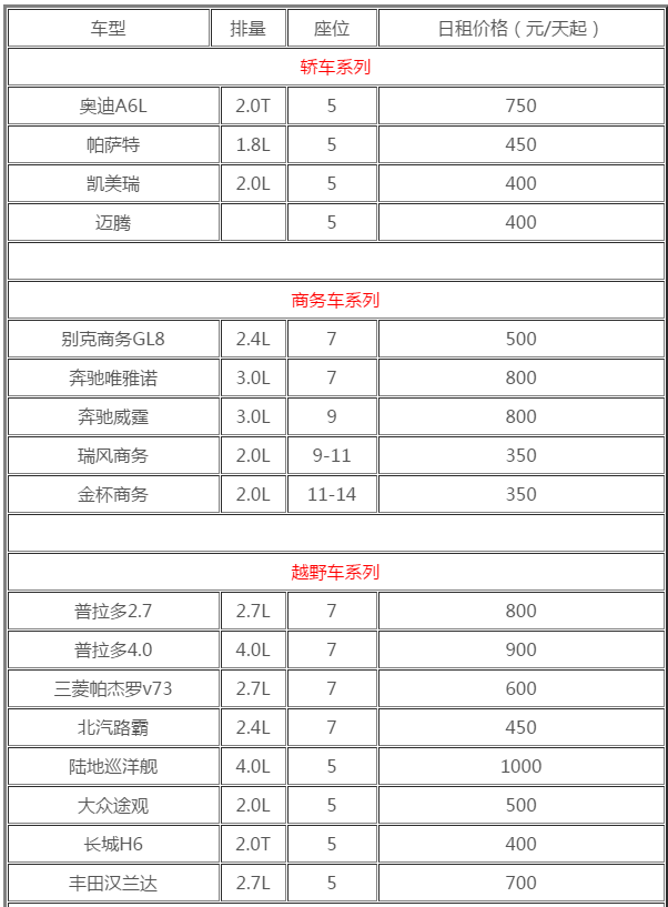 首先旅游租車費用一般由租金、押金這兩大塊組成。租金根據(jù)車輛類型、行程天數(shù)來決定租金的多少。日租金更是幾百到上千不等,并且成都租車車輛類型齊多根據(jù)需要可以輕松找到適合自己的。今天小編就為您帶來成都市租車價格表清單給大家一個參考,讓您了解最新的成都市租車價格,所租車型、排量、座位數(shù)、日租金一目了然,同時方便租車的客戶做一個對比,找出性價比高的租車公司。